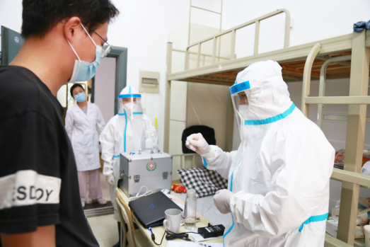 场景三演练的是学生到定点医院(浦口医院)发热门诊诊治检查。根据医院医生诊断意见排除新冠肺炎疑似病例,决定转送至学校隔离观察区青年公寓第11层进行医学观察。