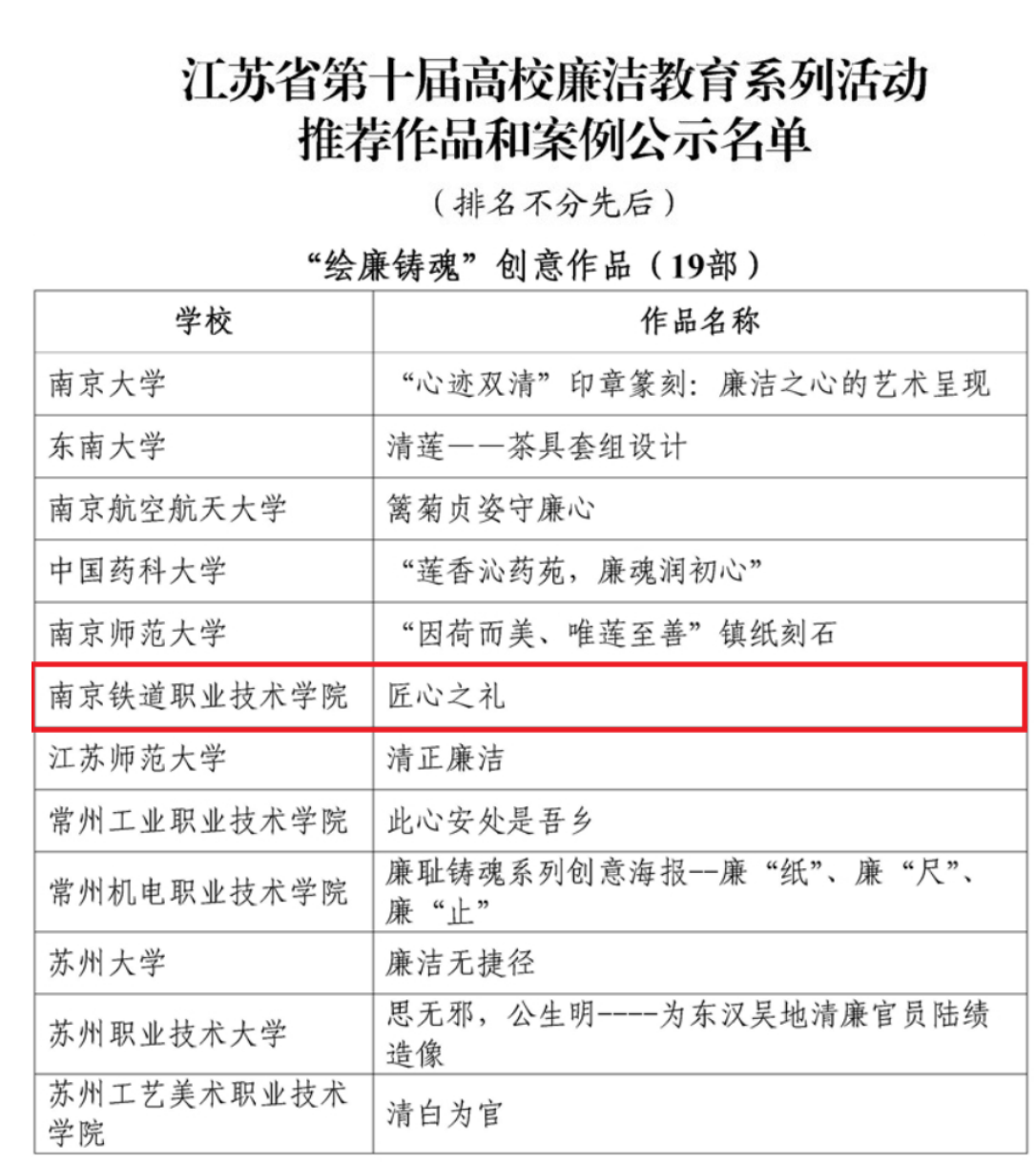 第十届高校廉洁教育系列活动由教育部思想政治工作司主办,以“清风育德守初心廉洁笃行担使命”为主题,旨在深化新时代高校廉洁文化建设。江苏省教育厅经高校推荐、专家遴选,共选出114件优秀作品和案例,我校报送的“绘廉铸魂”创意《匠心之礼》光荣入选。