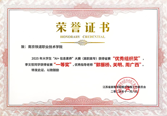 近日,由江苏省高等学校图书情报工作委员会承办的2025年大学生“AI+信息素养”大赛省级决赛落下帷幕。我校凭借出色的赛事组织与师生的优异表现,一举斩获 “优秀组织奖”;铁道运输学院学生李文哲脱颖而出,摘得江苏省高职高专赛道一等奖;图文与信息技术中心、档案馆郭振桥、关明、周广西三位老师获“优秀指导老师”。