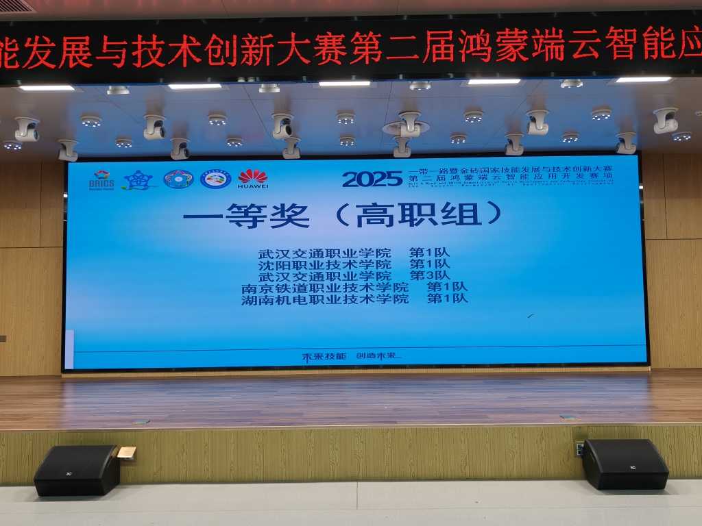 12月6日,2025“一带一路”暨金砖国家技能发展与技术创新大赛之第二届鸿蒙端云智能应用开发赛项决赛在武汉交通职业学院圆满落幕。来自全国56所本科高职院校的74支队伍同台竞技。经过激烈角逐,我校未来交通学院移动应用开发专业张德福、常煜旸、杜磊三位同学荣获高职组团体一等奖,张中秋、朱蓓芳获优秀指导教师称号。