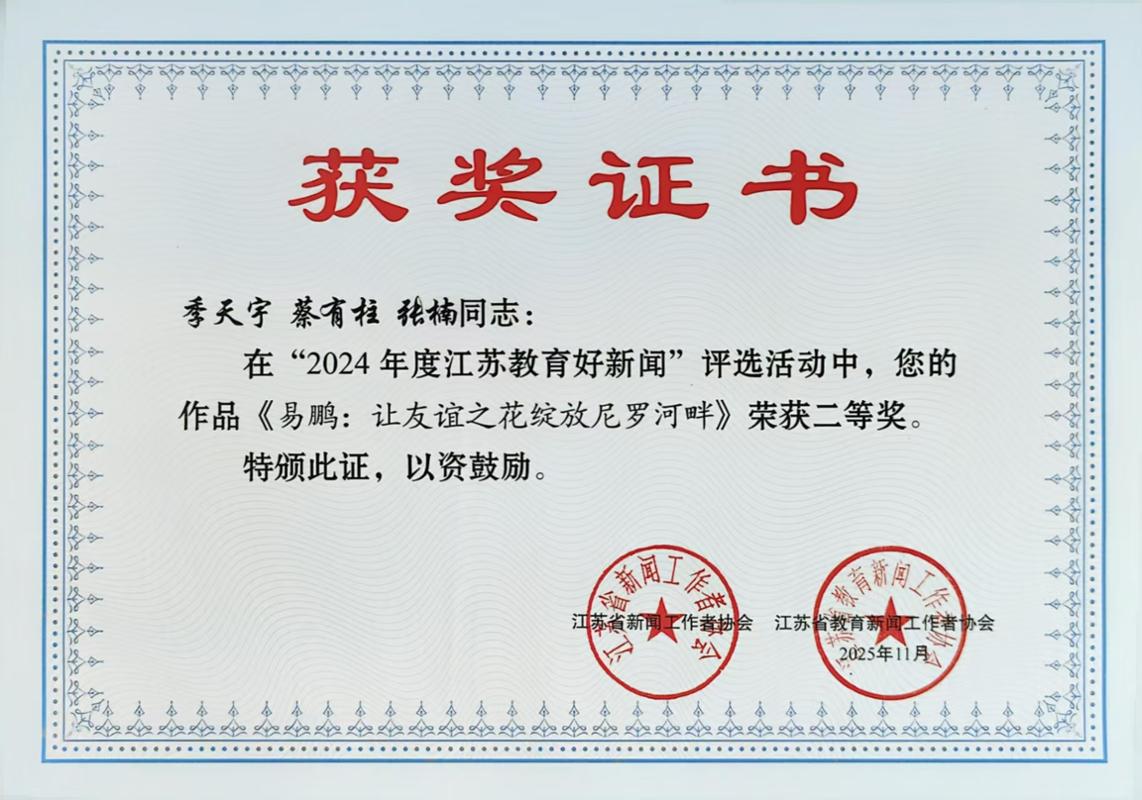 近日,2024年度江苏教育好新闻评选结果正式公布,我校选送的融合报道作品《易鹏:让友谊之花绽放尼罗河畔》凭借鲜明的时代主题、生动的内容呈现与广泛的社会影响,荣获二等奖。