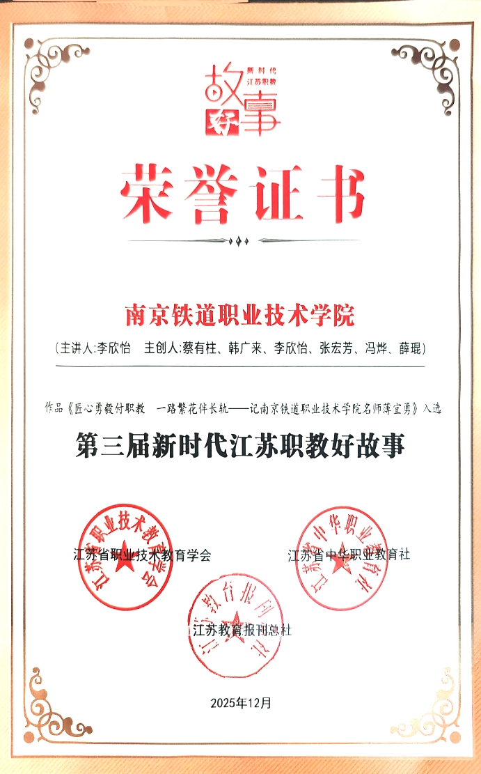 近日,江苏省职业技术教育学会发布《第三届新时代江苏职教好故事名单》,我校选送的项目《匠心勇毅付职教 一路繁花伴长轨——记南京铁道职业技术学院名师薄宜勇》成功入选本届新时代江苏职教好故事。