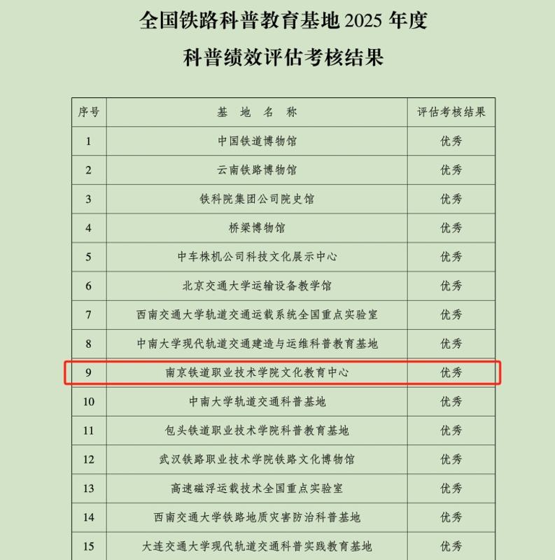 近日,中国铁道学会公布全国铁路科普教育基地2025年度科普绩效评估考核结果,我校江苏铁路教育馆获评“优秀”等次。此次参评的全国铁路科普教育基地共45家,获评“优秀”的基地有15家。