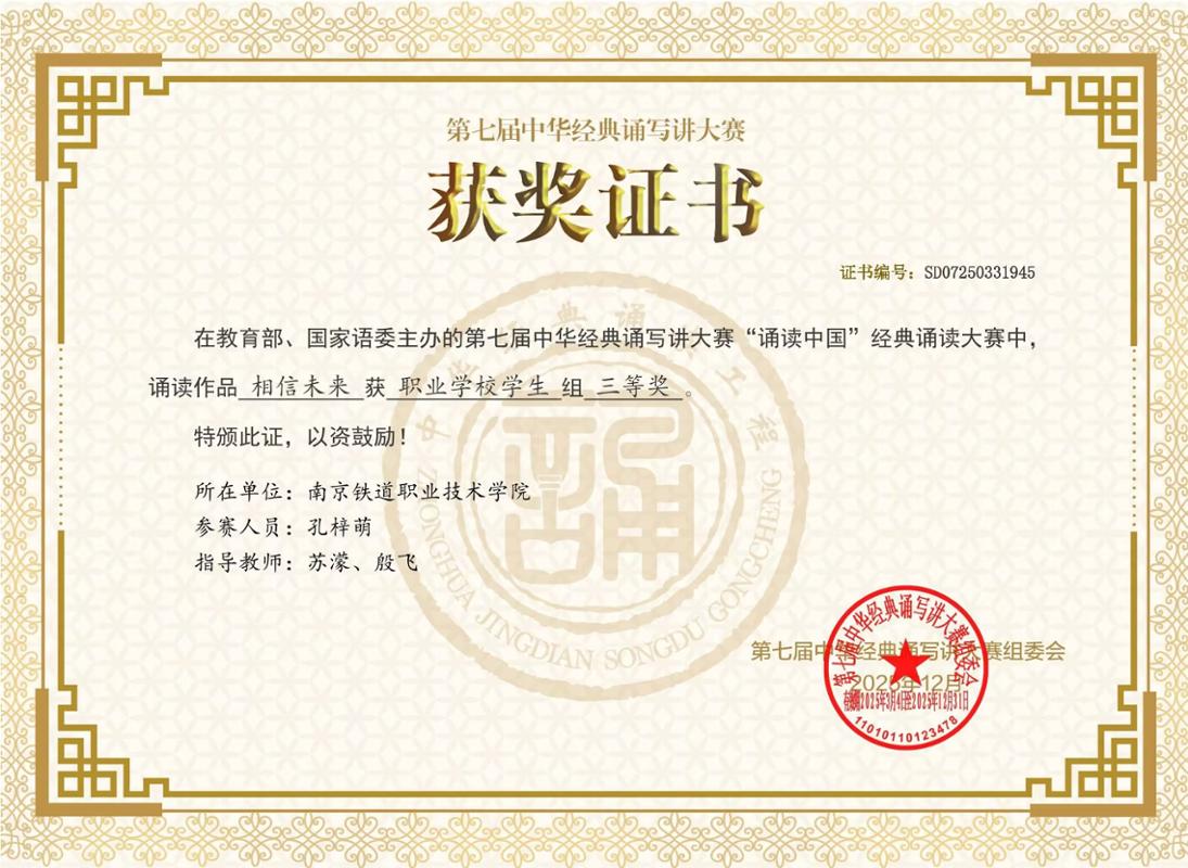 近日,由教育部、国家语言文字工作委员会联合主办的第七届中华经典诵写讲大赛获奖名单正式公布。由我校基础教学部选送的诵读作品《相信未来》(指导教师:苏濛、殷飞;诵读学生:铁道机车2403班孔梓萌)在入围初赛的547万余件作品中,经复赛、决赛层层选拔,最终获全国“诵读中国”经典诵读大赛职业学校学生组三等奖,创我校参加该赛项以来最佳成绩。