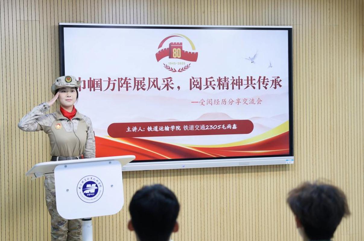 12月17日下午,南京铁道职业技术学院人武部举办了一场以“巾帼方阵展风采,阅兵精神共传承”为主题的阅兵经历分享交流会。曾服役于驻香港部队文工团、今年参加九三阅兵民兵方阵的毛雨鑫同学回归校园,为我校国旗护卫队带来了一场感人至深、催人奋进的精神盛宴。现场气氛庄重而热烈,爱国情怀与报国热情在交流中持续激荡。