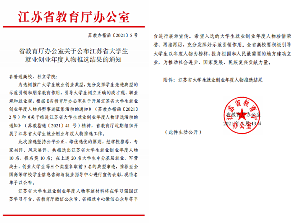 本次推选工作于今年4月启动,经学校推荐、专家初评、风采展评,共推选出江苏省大学生就业创业年度人物10名、提名奖10名;在上述 20名大学生中分基层就业、军营战士、创业大学生等三个类型各取前 5 名的典型事迹,推荐至全国高等学校学生信息咨询与就业指导中心进行宣传表彰。我校玄佳鑫同学作为基层就业大学生典型,其事迹《践行初心、不辱使命——玄佳鑫和玄绪州烈士的父子约定》被推荐至全国高等学校学生信息咨询与就业指导中心。
