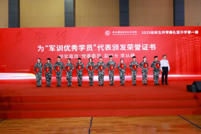 随后,学校党委委员为新生代表佩戴上南铁院校徽。这不仅是身份的赋予,更象征着南铁精神的接续与传承,标志着新生们正式融入了南铁院的大家庭。