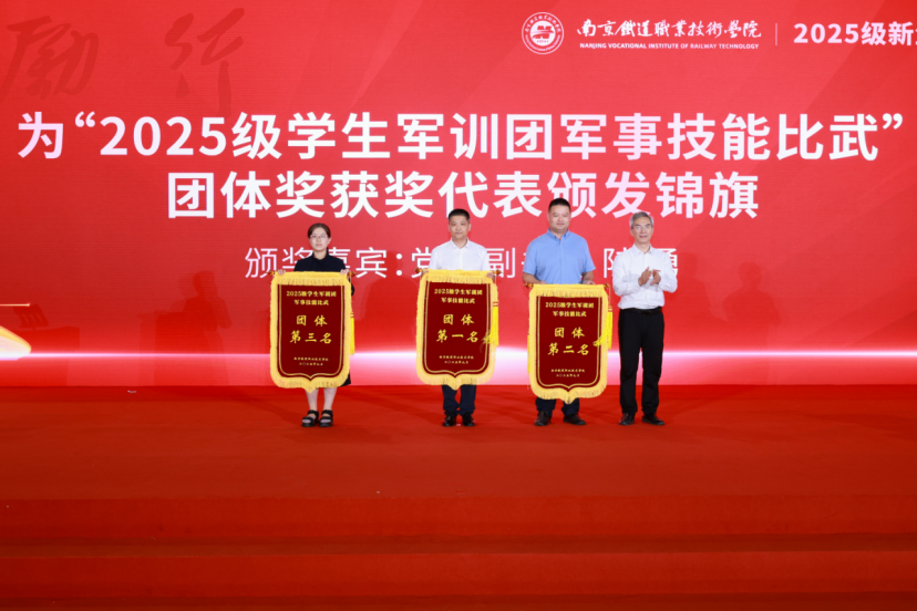 党委副书记陆勇为荣获“2025级学生军训团军事技能比武”团体奖代表颁发锦旗