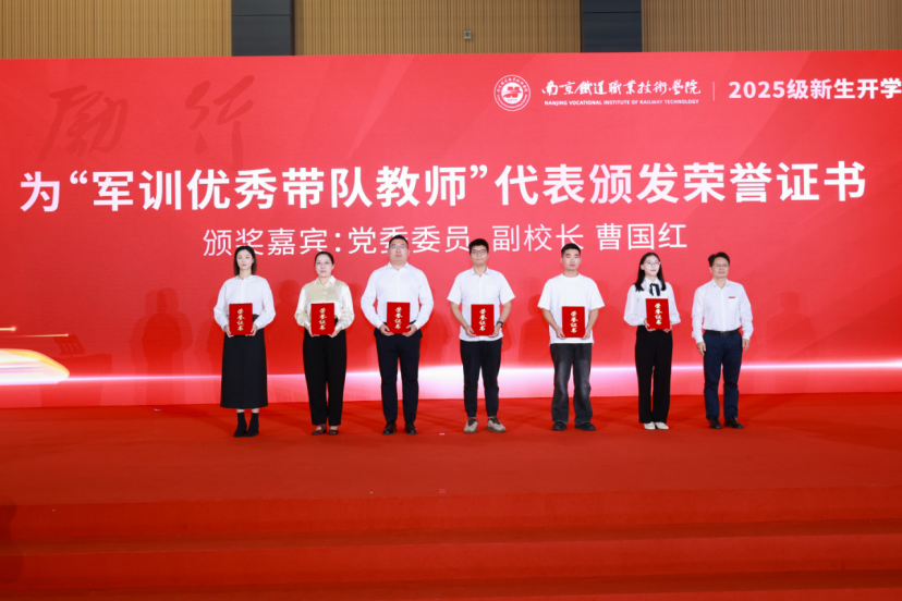 党委委员、副校长曹国红为荣获“军训优秀带队教师”代表颁发荣誉证书