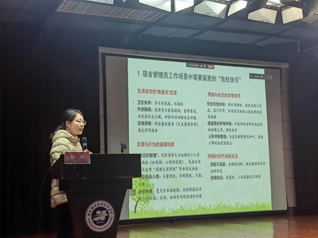 讲座中,吴垠紧扣高校心理危机工作实际,围绕三大核心模块展开深度讲解:一是常见心理障碍的识别要点与心理危机的早期预警信号;二是宿舍、校园值守等后勤高频工作场景下,心理危机的识别技巧与干预实操要点;三是心理危机干预工作中的权责边界,清晰划定岗位工作的“能”与“不能”。吴垠结合自身丰富的心理咨询与危机干预实战案例,深入浅出地拆解高危学生的识别方法、沟通安抚技巧与规范处置流程,为参训人员厘清工作思路,明确不同岗位的核心职责。