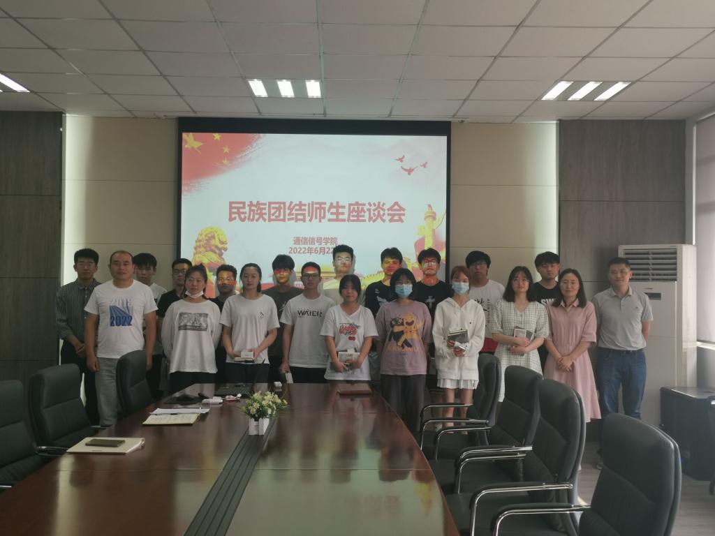 为持续推进民族团结进步创建工作,进一步巩固平等、团结、互助、和谐的社会主义民族关系,根据学校《关于民族团结进步宣传月活动的通知》要求, 6月22日下午,通信信号学院在天佑楼D525会议室召开少数民族学生座谈会,会议由学管主任朱明月主持,学院党总支副书记高明、团总支书记朱志杰、年级辅导员杨琎和全体少数民族学生参加了此次会议。
