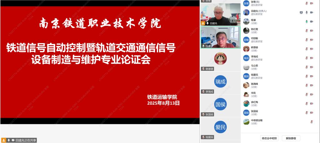2025年8月13日,铁道运输学院铁道信号系通过腾讯会议召开2025级人才培养方案线上论证会,对“铁道信号自动控制”和“轨道交通通信信号设备制造与维护”两个专业的人才培养方案进行集中论证。上海铁路局合肥电务段副段长施海峰、南京电务段中修车间主任顾全敏、蚌埠职培基地信号教研室主任韩厚德应邀出席;学院党总支副书记、院长程谦,铁道信号系主任田建兆,专业主任张菊及全体专任教师全程参会。会议由田建兆主持。