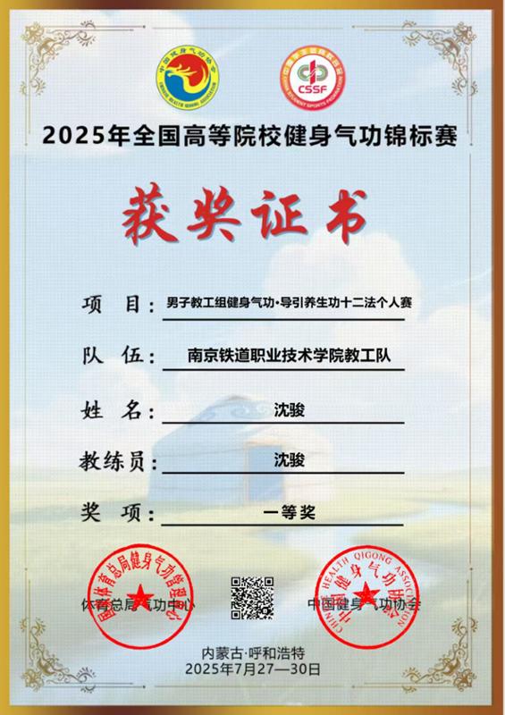7月26日—31日,由国家体育总局健身气功管理中心、中国学生体育联合会、中国健身气功协会、内蒙古自治区体育局主办的2025年全国高等院校健身气功锦标赛在内蒙古师范大学举行,我校教职工健身气功协会沈骏老师,获得男子教工组健身气功-导引养生功十二法个人赛一等奖。