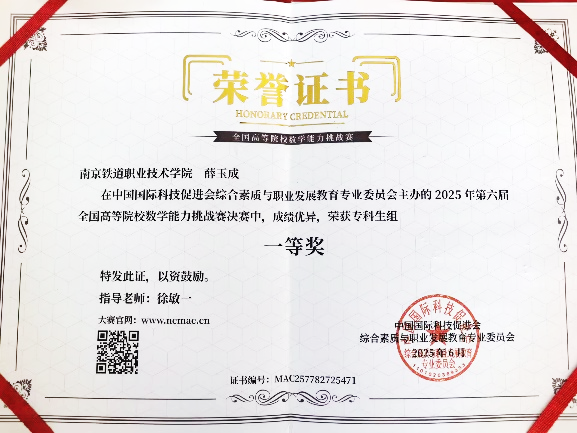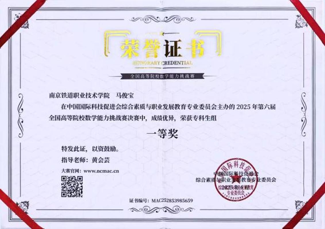 近日,2025年第六届全国高等院校数学能力挑战赛圆满落幕。我校学子在赛事中表现突出,斩获专科组全国一等奖2名、二等奖1名、三等奖2名,其中铁道供电L2302班马俊宝同学获专科组全国决赛一等奖第一名,充分展现南铁学子勤学善思、奋勇争先的风采,也印证了我校数学教育在夯实基础、培养能力方面的成果。