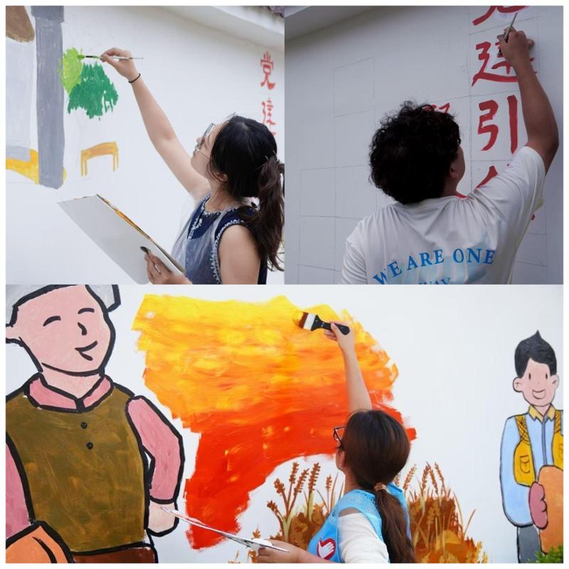 抵达唐庄村后,实践队迅速与当地村委对接,围绕“乡村振兴”、“党建引领”、“生态宜居”等主题,结合唐庄村特色与前期调研成果,精心设计墙绘方案。活动中,队员们分工协作:有人专注勾勒轮廓,有人细致调配色彩,有人耐心填充图案…… 从金黄的丰收麦田、生动的农家劳作场景,到各类文明标语,一幅幅色彩鲜亮、充满活力的墙绘在墙面逐渐成型,为原本朴素的乡村墙体注入艺术气息与时代活力。