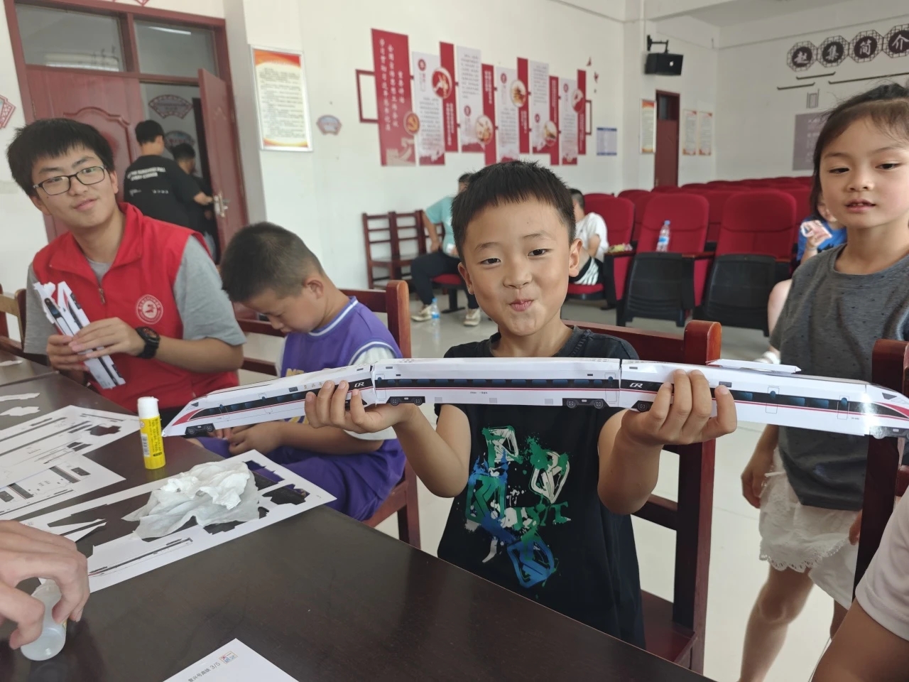 城轨制维2302班陈灿同学带领“七彩脉动”团队赴太和县赵集乡,为当地儿童带来了一场高铁知识科普活动。队员们化身“技术指导员”,通过耐心讲解和手把手示范,带领孩子们探索高铁的奇妙世界。每当孩子遇到困难,队员便俯身细致指导,用专业的知识和温暖的语言重建他们的信心,在寓教于乐中播下交通强国的种子。