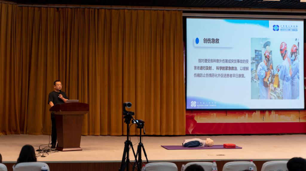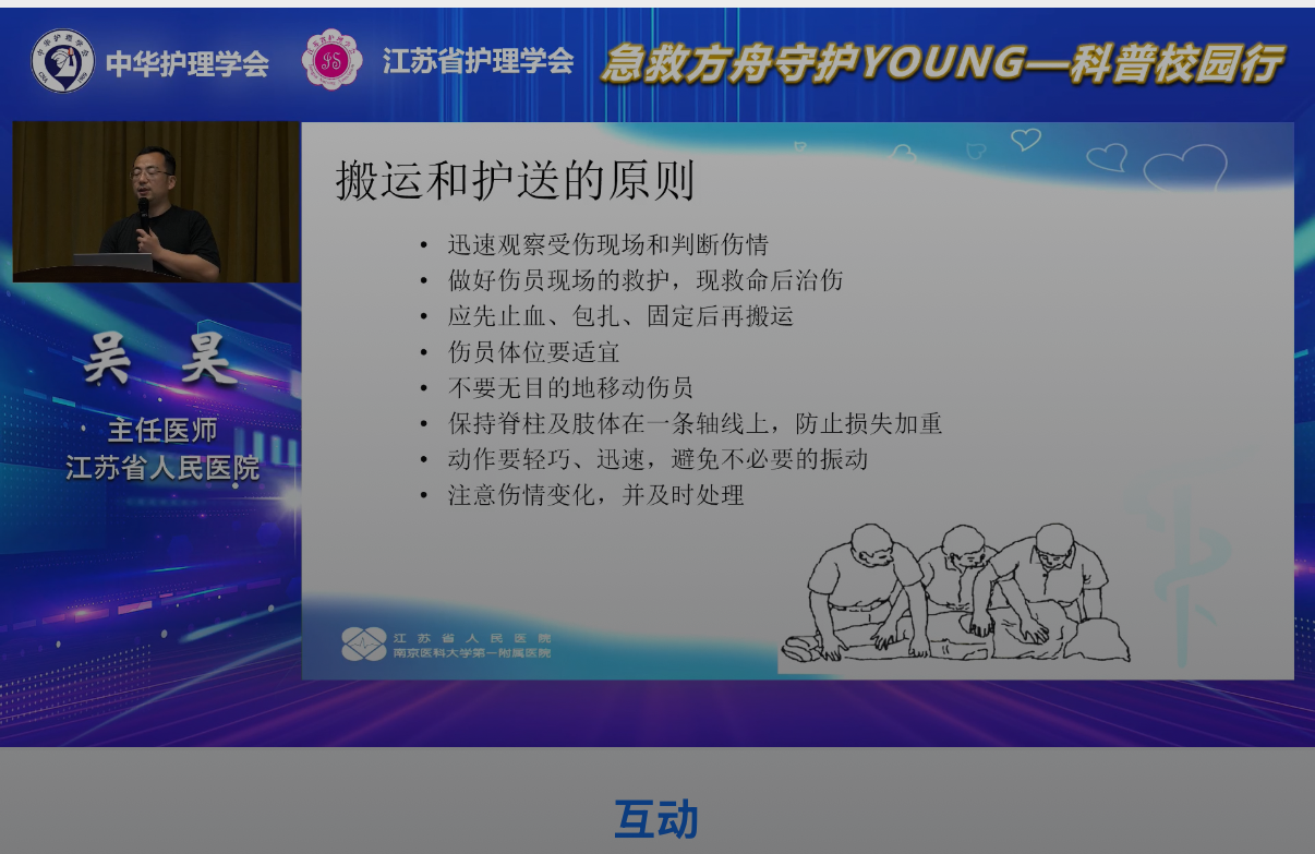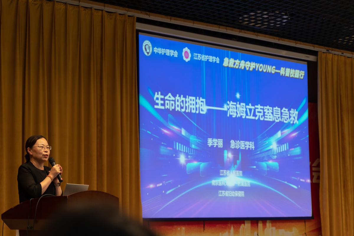 活动中,南京市第一医院急诊科沈华主任医师以“荒野求生——破解蛇咬伤的急救迷思”为题,结合实际案例讲解了蛇咬伤的应急处理;南京鼓楼医院急诊科护士长黄萍主任护师围绕“生命续航——掌握溺水生存链”,系统介绍了溺水救援的关键环节;江苏省人民医院急诊科吴昊主任医师带来“运动刺客——校园里的创伤应对”,聚焦常见运动损伤的现场处理;江苏省人民医院急诊科护士长季学丽主任护师通过“生命的拥抱——海姆立克窒息急救”,现场演示了气道异物梗阻的急救方法。