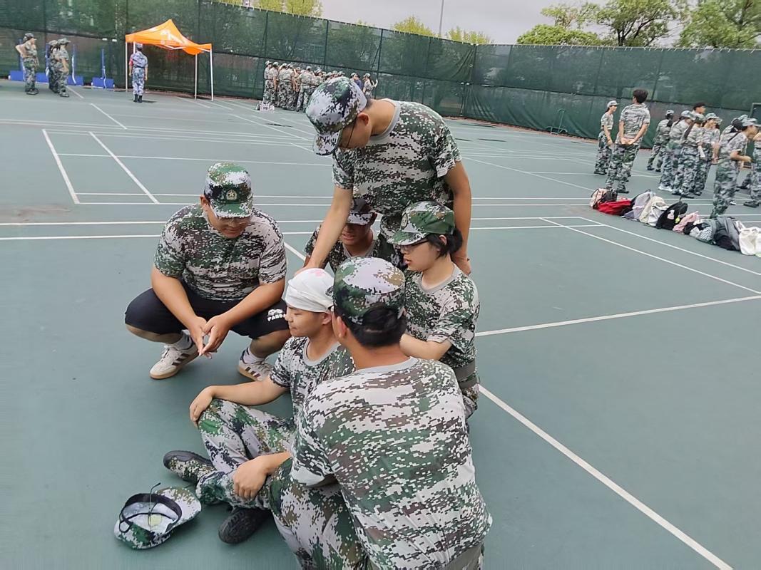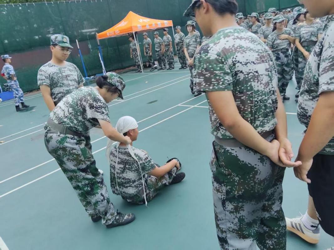 演练现场模拟了学生头部受伤的突发场景:一名同学因“意外”感到头部不适,在场同学迅速上前查看。在教官的指导下,大家立即取来三角巾,按照流程为“伤员”进行头部包扎。教官边示范边强调要点,从折叠方法、覆盖位置到松紧控制,逐一纠正,确保每位同学掌握“快、准、稳”的操作核心,理解正确包扎对止血和保护伤口的关键作用。