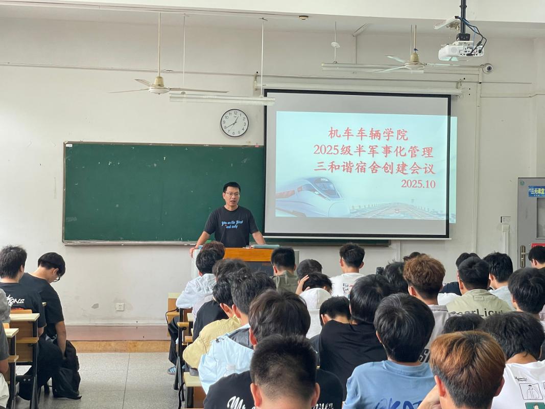 为深入落实学校半军事化管理要求,扎实推进“三和谐宿舍”建设,10月17日中午,机车车辆学院在天佑楼C503召开2025级半军事化管理专项工作会议,并举行半军事化管理教官聘任仪式。辅导员高萍、陈亚州、全体半军事化管理教官、半军事化管理委员及2025级100多名宿舍长参会。