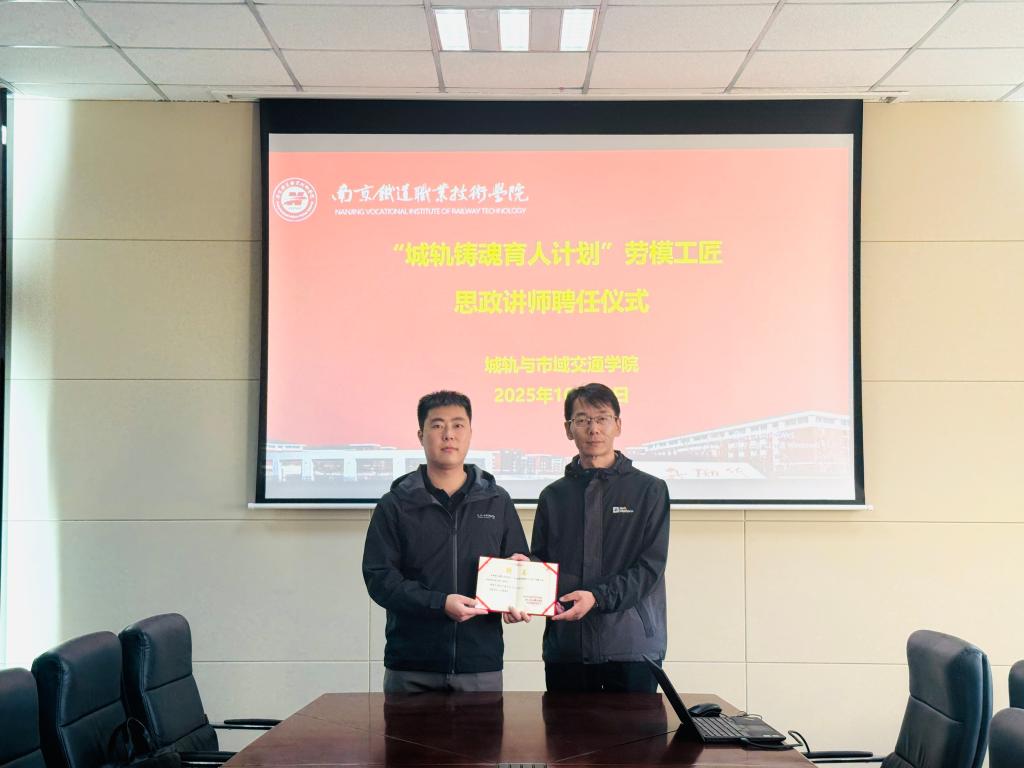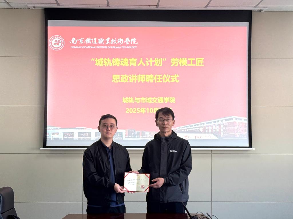 在专业教育同时,城轨与市域交通学院开展了“轨道交通铸魂育人计划”劳模工匠思政讲师团导师聘任活动,分别聘任上海电务段孙升和南京供电段刘辉为讲师团讲师,学院院长赵德生为两位讲师颁发了聘书,此次活动将专业认知教育与思想政治教育深度融合,旨在引导新生扣好大学生涯的“第一粒扣子”,为其成长为精于技艺、富于匠心、忠于使命的城轨交通卓越人才奠定坚实基础。