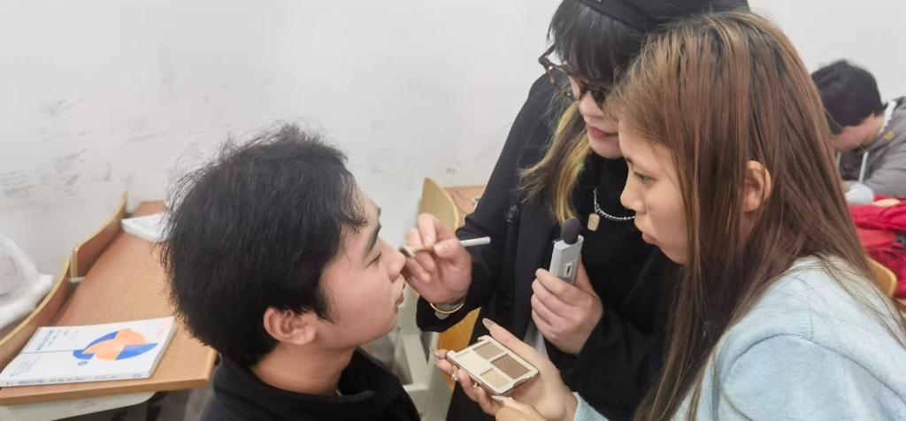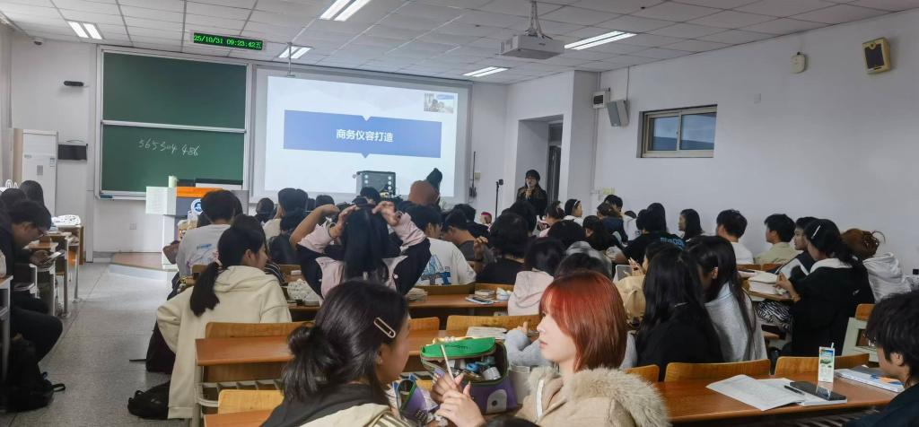 实操演示环节成为讲座的一大亮点。两位老师邀请学生代表上台,现场进行商务妆容打造示范,从底妆服帖技巧、眉形与脸型的适配,到职场通勤眼妆的画法、口红颜色的选择等,每一个步骤都细致讲解、耐心指导。同时,针对同学们提出的 “油性皮肤如何保持妆容持久”“戴眼镜如何画眼妆”“男性商务仪容注意事项” 等问题,老师逐一解答,提供了实用易懂的解决方案。现场互动热烈,同学们认真记录要点,纷纷拿出手机拍摄实操细节,学习热情高涨。听完讲座后,同学们表示,通过讲座掌握了基础的商务仪容技巧,不仅提升了个人形象素养,更对 “商务礼仪” 有了更具象的理解。