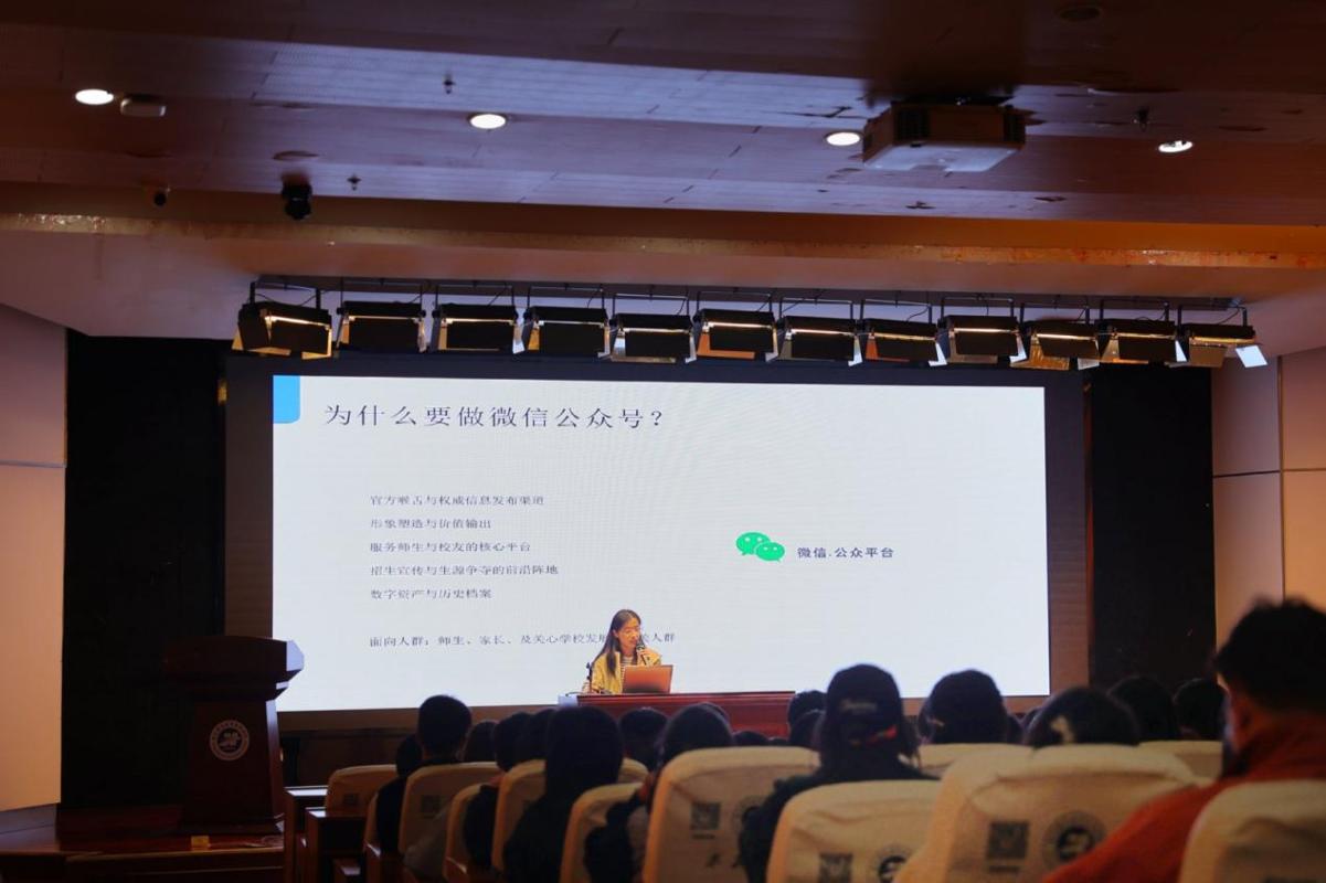 季老师结合行业前沿动态,剖析了高校新媒体平台建设的机遇与挑战,重点围绕 “高校微信公众号运营” 展开深度分享。她通过实操案例,拆解了 “内容策划、素材采集、排版设计、推广传播” 全流程技巧,强调选题需紧扣校园热点、挖掘师生故事、结合时代主题,让在场师生形成系统性、实操性认知。