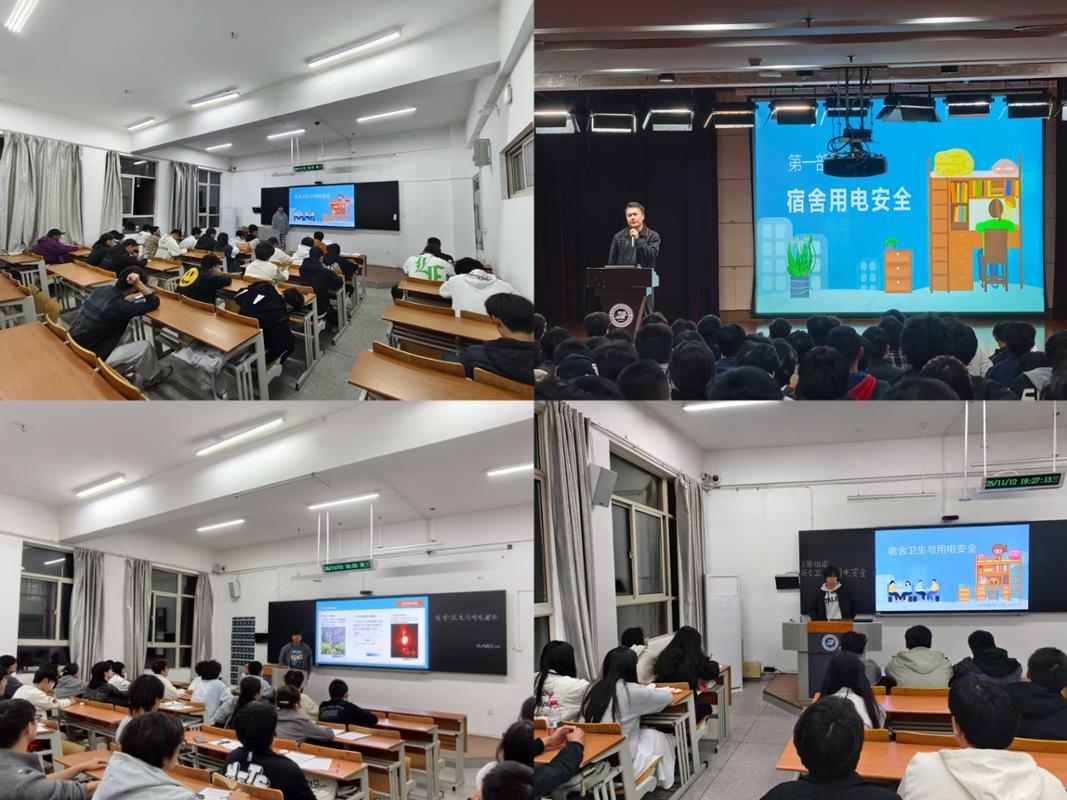 各班通过PPT展示近期国内外高校发生的几起触目惊心的宿舍火灾案例图片与视频资料,以真实案例敲响安全警钟,深刻剖析了违规使用电器、私拉乱接电线、电器使用不当等行为带来的巨大安全隐患和惨痛教训,使同学们直观感受到火灾的无情与掌握消防知识的紧迫性。围绕“宿舍用电安全”与“消防安全”两大主题,向同学们系统阐述了相关规章制度与防范要点: