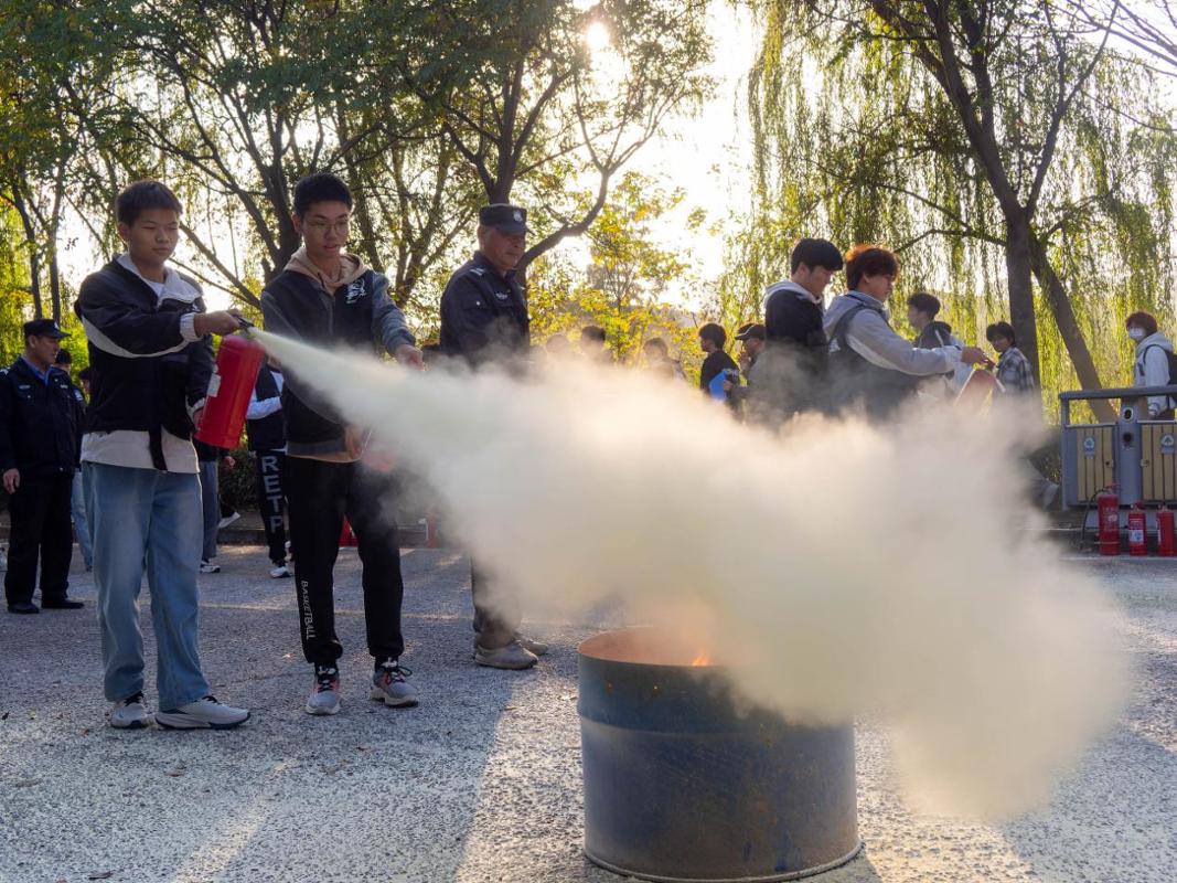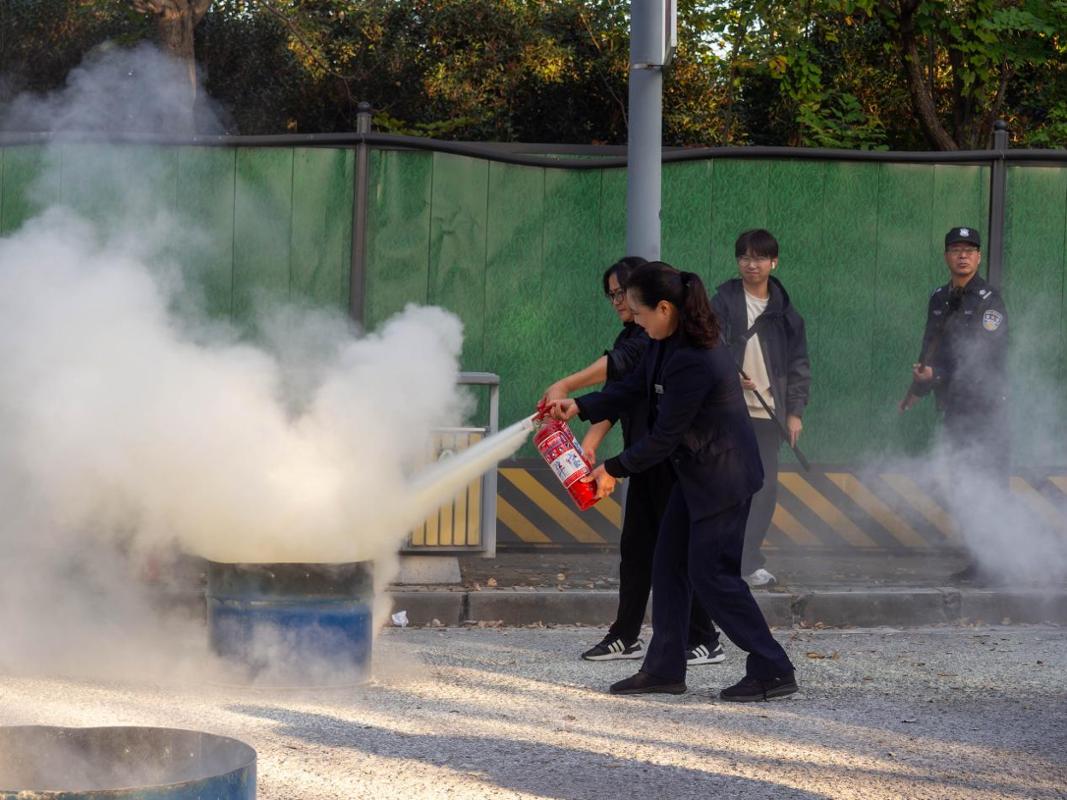 在实战演练环节,参训人员被分成多个小组,在消防救援人员和我校安全保卫处专业人员的全程指导下,有序开展灭火实操训练。每位参训人员都严格按照“判断风向—拔掉保险销—对准火焰根部喷射”的标准流程,认真完成“提、拔、握、压”操作要领,成功扑灭设定的模拟火源,切实提升了应对初期火灾的实战能力。