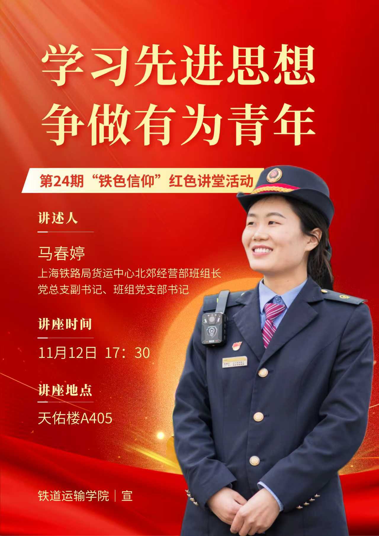 11月12日晚,铁道运输学院联合城轨与市域学院举办校友报告会暨第24期“铁色信仰”红色讲堂活动,活动特别邀请到优秀校友、2018届毕业生马春婷重返母校,为同学们带来一场精彩且富有教育意义的讲座。