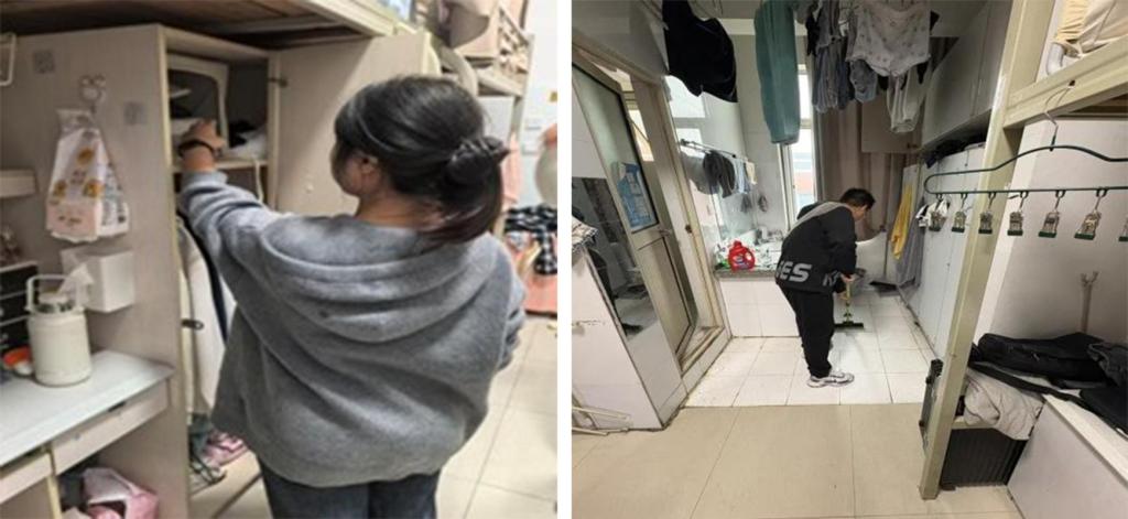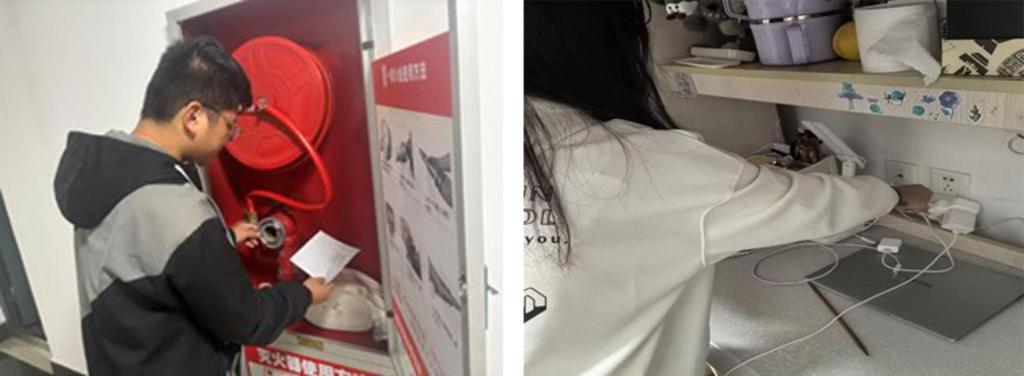 社区党支部充分发挥引领作用,将宿舍消防安全排查纳入每月重点工作,党员带头深入学生宿舍,对用电安全、消防设施、疏散通道等关键环节进行全覆盖检查,重点排查大功率电器、私拉乱接电线等常见隐患,发现问题及时登记并督促整改到位。同时通过主题党日、安全知识讲座、典型案例警示教育等形式,向同学们普及消防安全知识和应急处置技巧,切实强化大家的安全防范意识。学院团总支积极响应号召,以志愿服务为载体开展精准帮扶,志愿者们走进宿舍,结合日常安全风险点,细致讲解电器使用规范、火灾逃生方法和隐患自查要点,还手把手教大家分类摆放衣物、书籍,清理卫生死角,协助优化宿舍物品摆放布局,引导大家养成整洁有序的生活习惯。同学们也主动参与到创建中,以宿舍为单位自发开展卫生大扫除和安全隐患自查自纠,分工协作清理公共区域、把关用电安全。