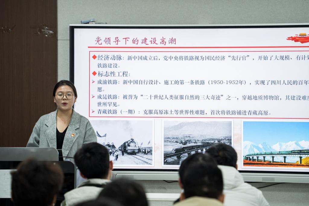 随后,公开课正式开讲。学生党员余秀文以《铁轨铸初心 精神照征程》为题,带领大家沿着历史脉络回溯中国铁路奋进史。从旧中国路权沦丧的屈辱,铁路工人阶级的红色觉醒,到新中国成渝、成昆、青藏铁路建设中的艰苦奋斗,再到如今高铁领跑世界、中欧班列联通亚欧的辉煌成就,她用一个个详实的案例,生动诠释了铁路事业“坚守创新、奉献担当”的精神内核,让同学们深刻感受到中国铁路发展如史诗般的波澜壮阔与厚重深沉。