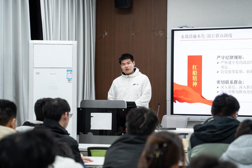 紧接着,学生党员沈晁旭以《弘扬红船精神 勇立时代潮头》为主题,深入解读红船精神的“首创、奋斗、奉献”三重内涵。他将红船精神与党的初心使命、历史传承紧密结合,阐释了其在新时代铁路事业中的实践价值,并号召同学们将红船精神融入专业学习,筑牢思想根基、锤炼过硬本领,在铁路事业中勇立潮头、建功立业。