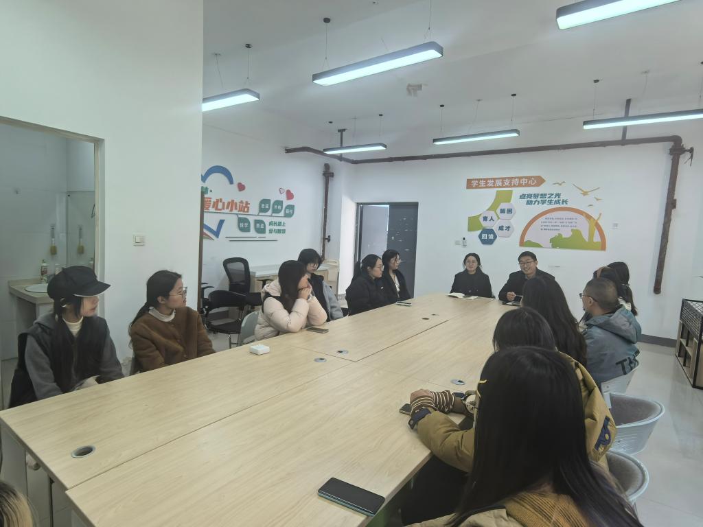 2025年11月26日中午,城轨与市域交通学院在一站式学生社区“驿之林·暖心小站”为2024级全体转专业学生举办了一场别开生面的座谈会。学院党总支副书记朱志超、副院长杨小燕、辅导员魏洁与13位转专业学生面对面交流,让学子们在一站式社区的暖心氛围中感受学院的关怀与支持。