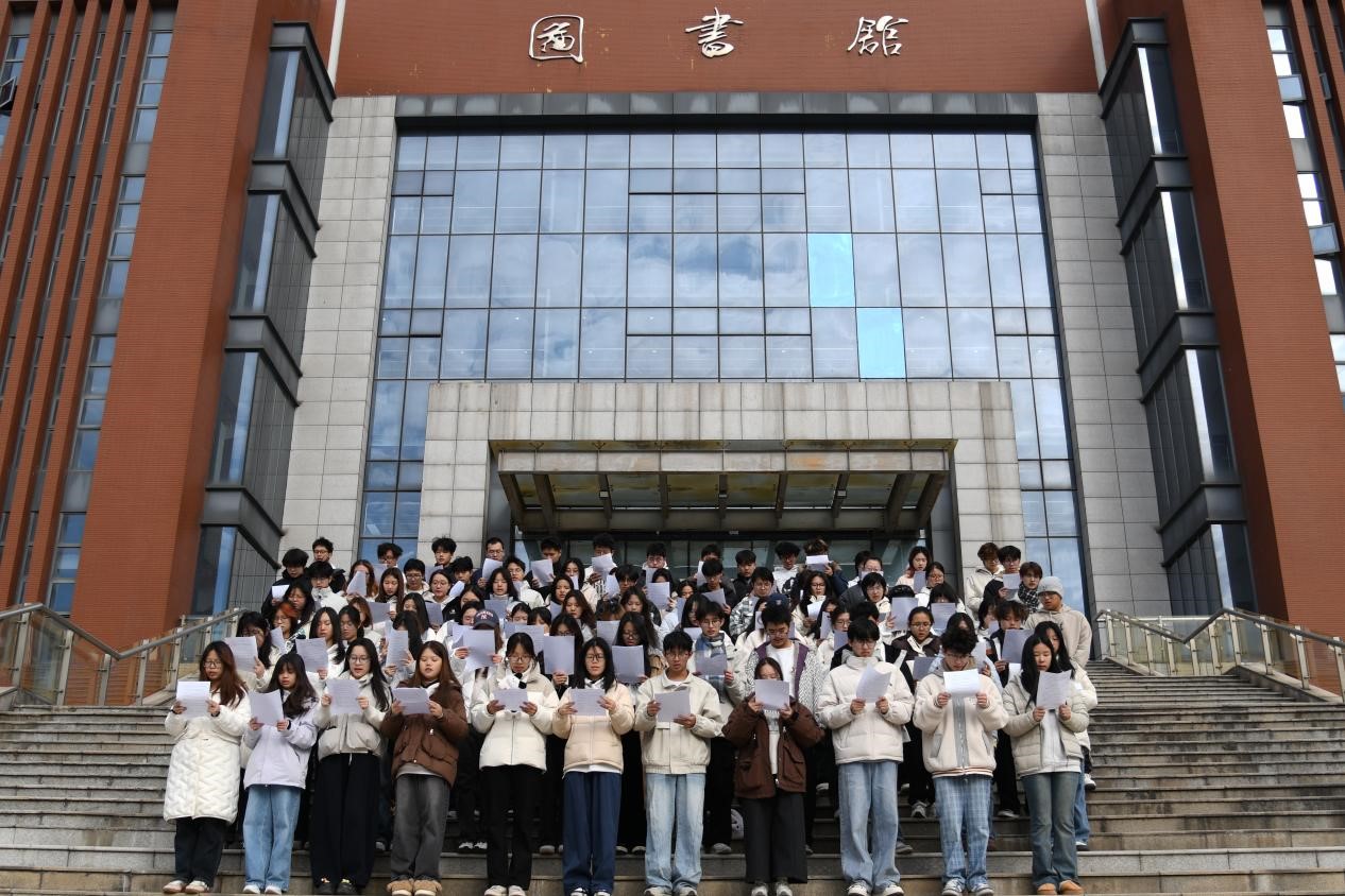 同学们在台阶上整齐站立,在领读同学的带领下,逐字逐句诵读宪法序言和核心条文。大家清晰有力的诵读声在校园里回响,既体现了宪法的严肃性,也表达了同学们对法治精神的尊重。
