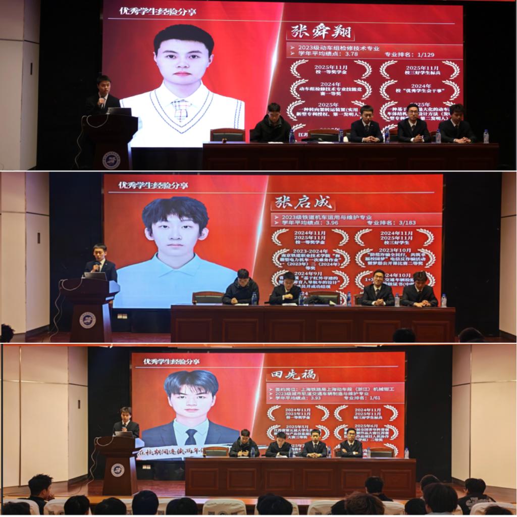 为增强经验分享的针对性和感染力,本次会议还邀请了另外三位国家奖学金获得者——城轨制维2301班田先福、铁道机车2303班张启成、动检2303班张舜翔进行交流。三位同学结合期末备考的关键阶段,分享了学业提升路径与时间管理方法等内容,特别强调了诚信考试的重要意义,鼓励在座同学以真实努力赢得扎实成绩,以诚信品格守护受助初心。