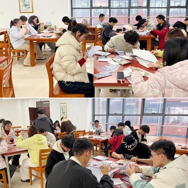 活动筹备阶段,图文与信息技术中心充分考虑文化性与实用性,为同学们准备了全套制作材料包,涵盖“洛神赋”“兰亭序”“声声慢”“千里江山”四种经典文化主题款式,搭配精美流苏与装饰蝴蝶,让书灯既承载传统意蕴,又兼具时尚美感。为帮助同学们高效完成作品,活动设置“视频讲解 + 现场指导”双重保障:同学们先通过视频清晰掌握折叠、组装步骤,遇到疑问时,馆员助手及时上前示范细节、解答难题,从纸张对折的角度把控,到流苏固定的技巧,再到LED灯珠的安装巧思,每一个环节都细致入微。