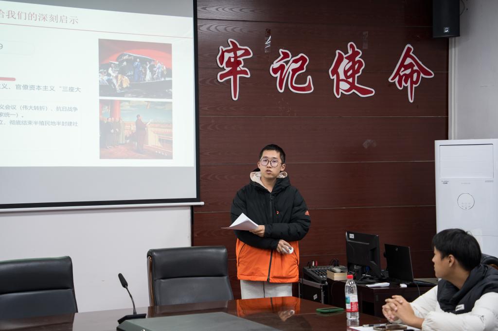 党史回顾环节,马浩阳带领同学们回顾“百年大党:从石库门到天安门的奋斗史诗”,穿越时空,感受党的光辉历程;董宇航讲解“井冈山精神与井冈山的斗争”,让同学们体会到革命先辈的坚定信念和顽强意志。还有同学结合时事政治,引导大家分析形势、把握趋势,培养同学们的大局观和政治素养。