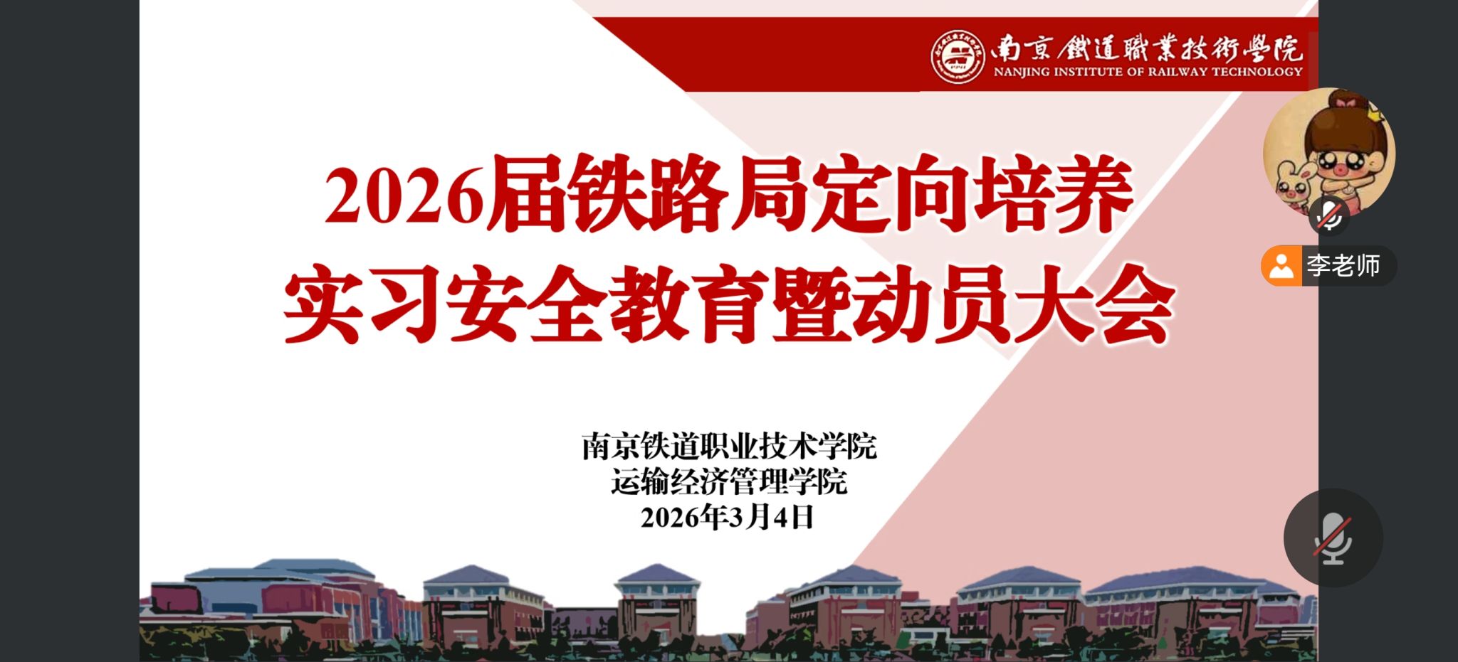 为切实做好铁路局定向培养学生顶岗实习工作,强化学生安全意识和岗位责任,3月4日我院召开了2026届铁路局定向培养实习安全教育动员大会。会议由教学秘书李进主持,学院副院长孔月红、学院党总支副书记陶荣兵、物流系主任李红雨、辅导员王乃君及学院全体2026届铁路局实习生参加了此次会议。