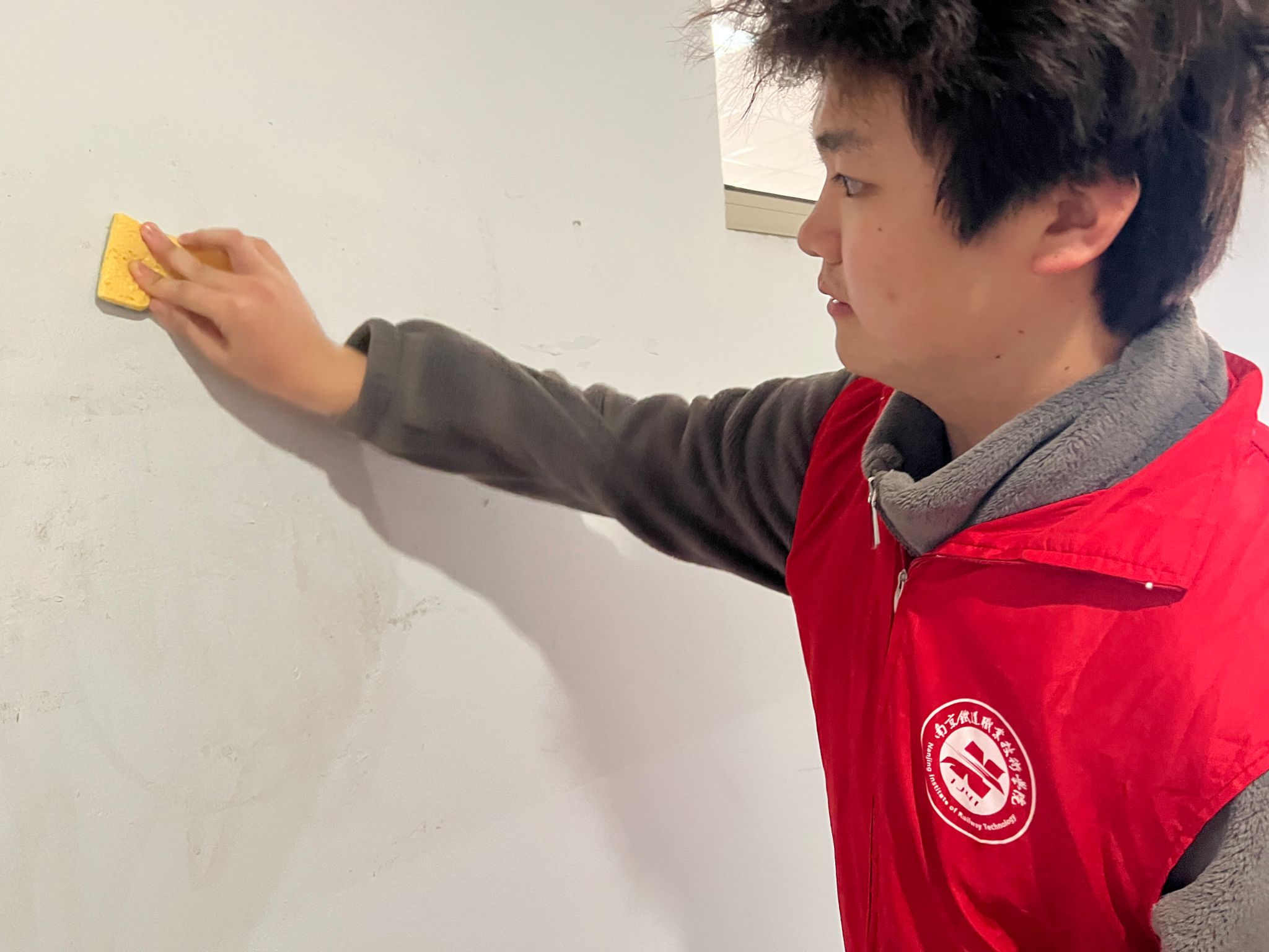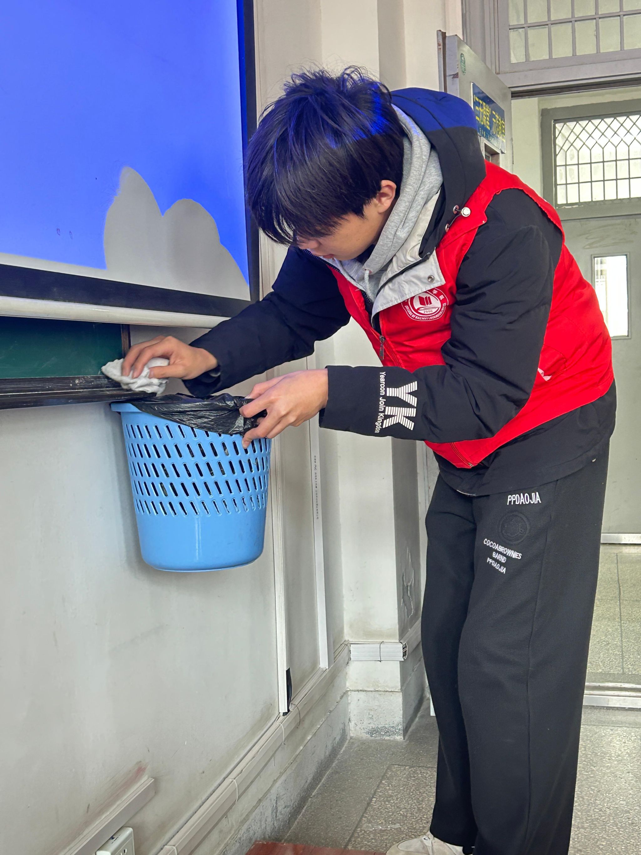 活动现场,9名志愿者在天佑楼前集合,在青协负责人的统一安排下,大家领取抹布、扫帚、垃圾袋等工具,分组进入各自负责的教室和楼层。活动中志愿者们分工协作:有的用抹布仔细擦拭黑板、讲台和课桌,清除积存的灰尘;有的检查并关闭每扇窗户,整理墙角、窗台的杂物;还有的俯身清理课桌抽屉内的废纸、包装袋等垃圾,不放过任何卫生死角。经过近两小时的劳动,天佑楼一至五层的12间教室和公共区域焕然一新,共清理出各类垃圾约5袋,黑板、桌面光洁如新。