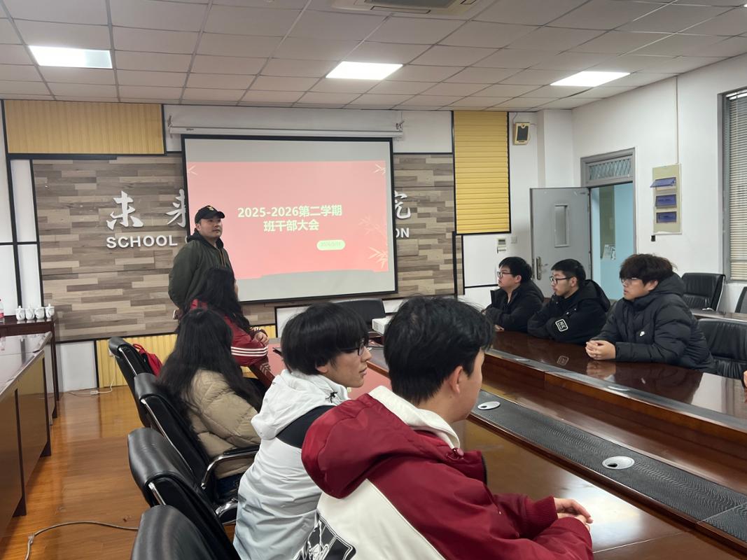 为明确新学期工作方向,夯实学生骨干队伍建设,确保年级各项工作平稳有序、高效开展,3月11日,未来交通学院2025级在信息中心会议室召开新学期学生干部工作会议。会议由2025级辅导员朱俊岩主持,全体班干部参会。