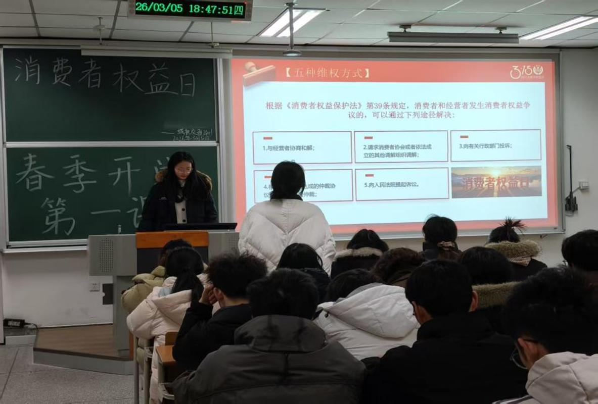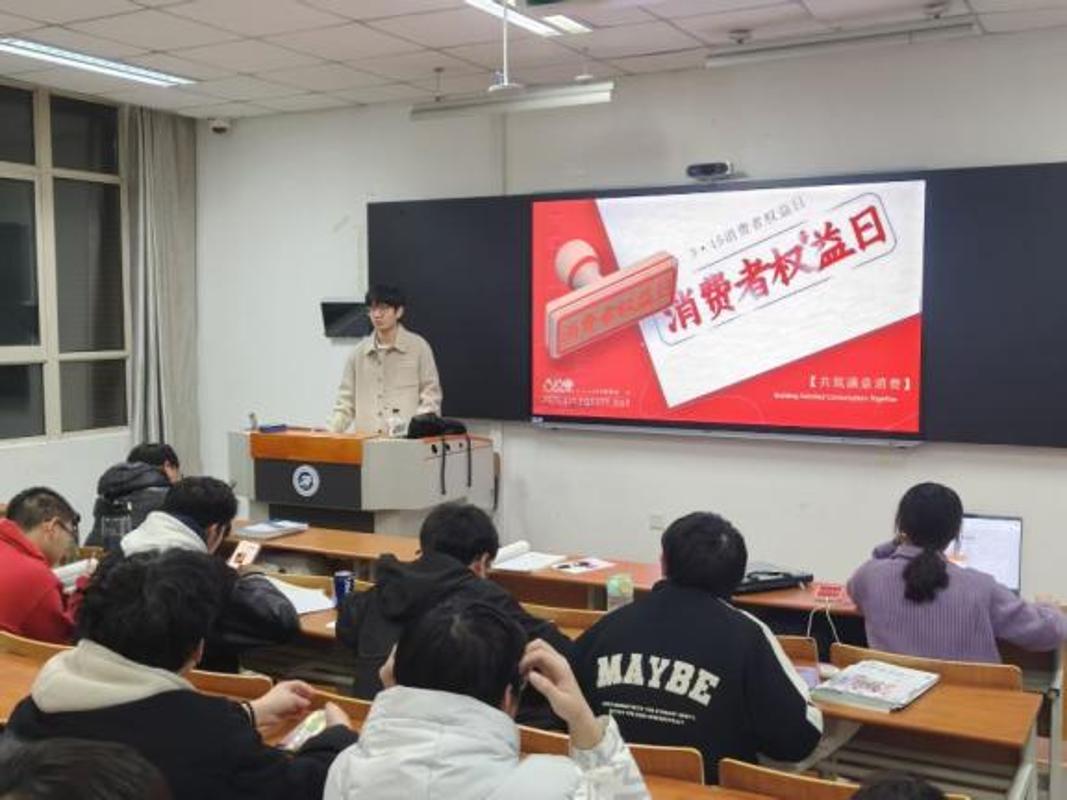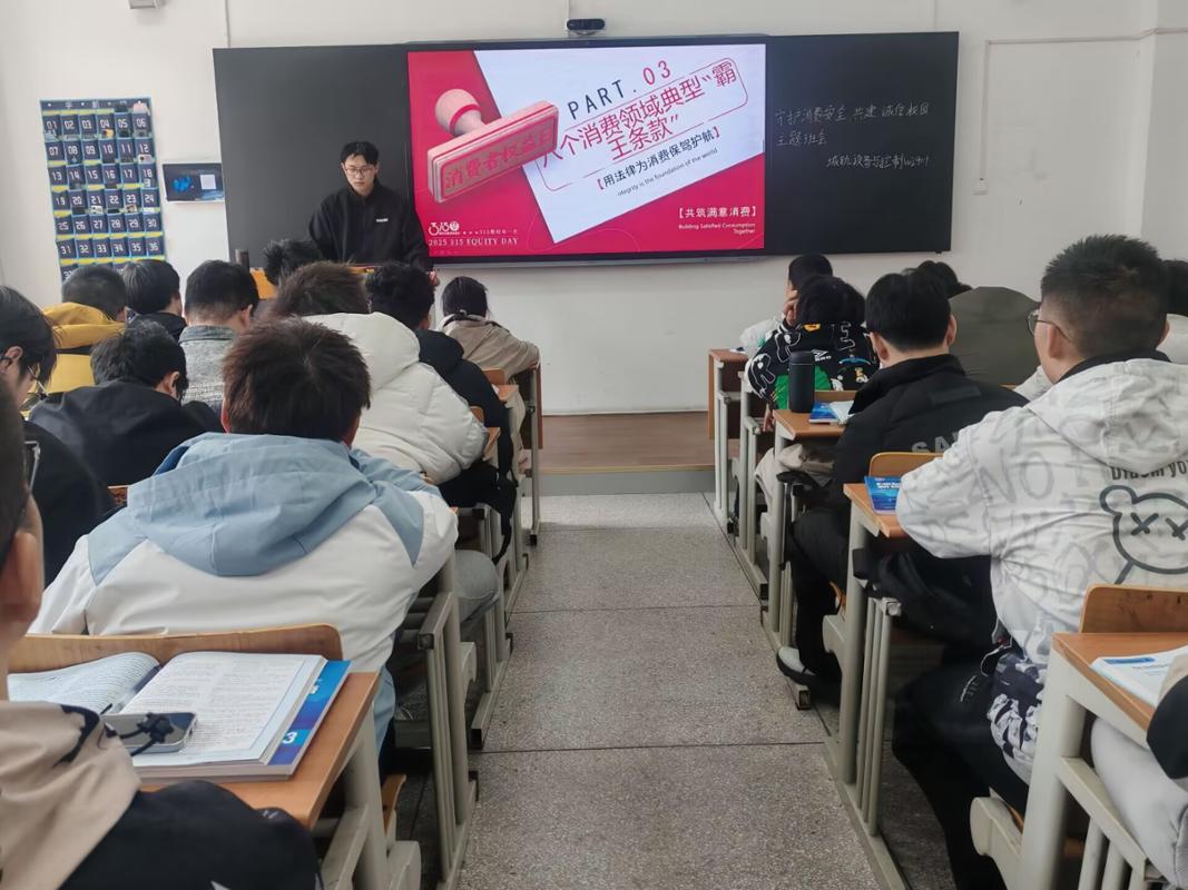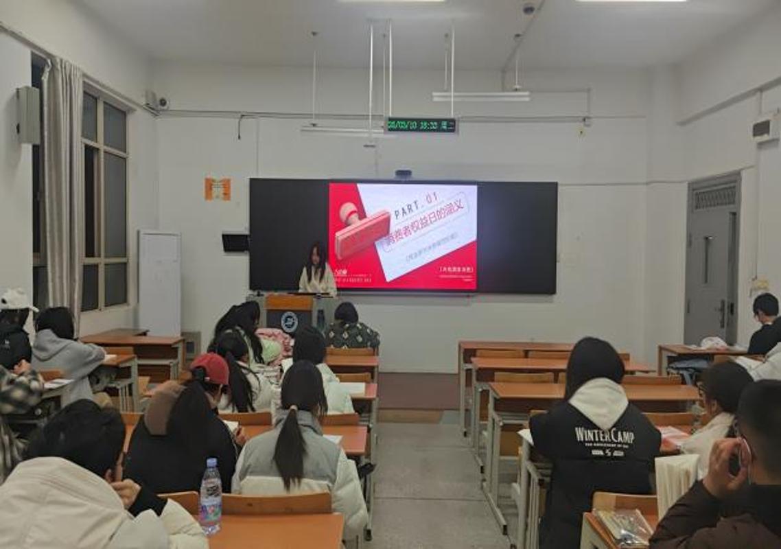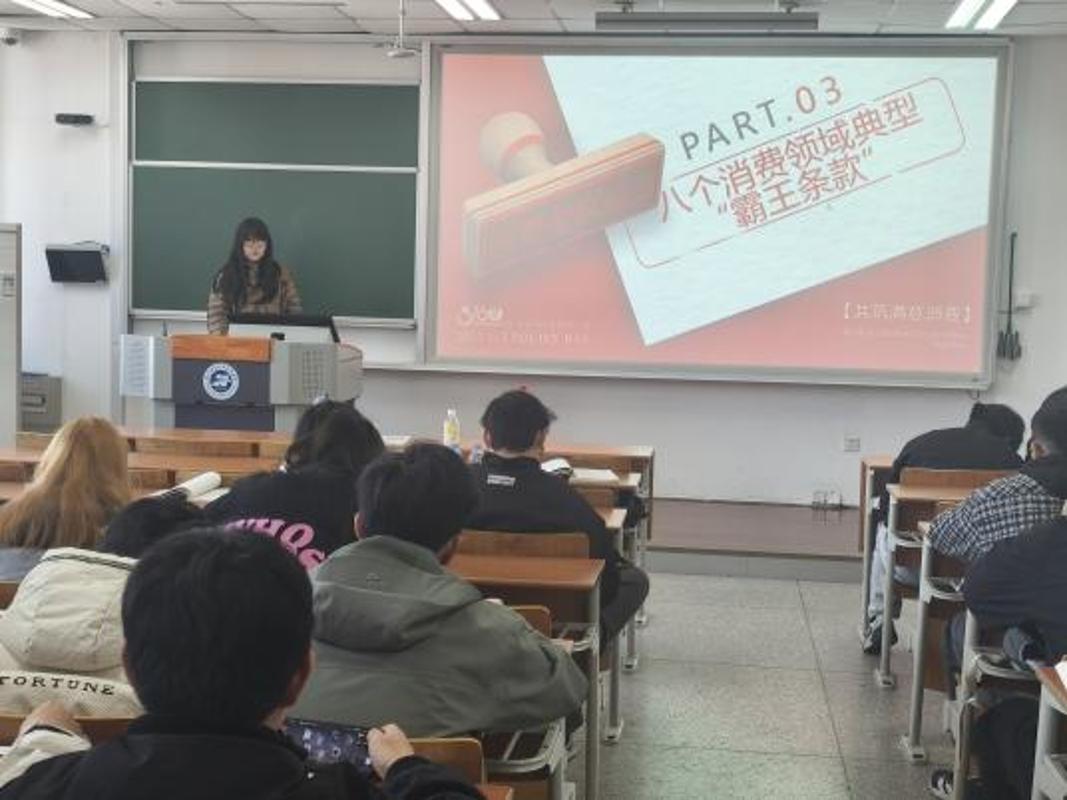 针对当下大学生常见的消费场景,班会特别设置了“消费领域典型‘霸王条款’”警示教育环节。通过剖析购物、教育培训、网络游戏、医美、旅游、房屋消费、快递及车辆消费等八个领域的典型案例,同学们学会了如何识别诸如“清仓商品不退换”、“最终解释权归商家所有”等无效格式条款,增强了法律辨别力。