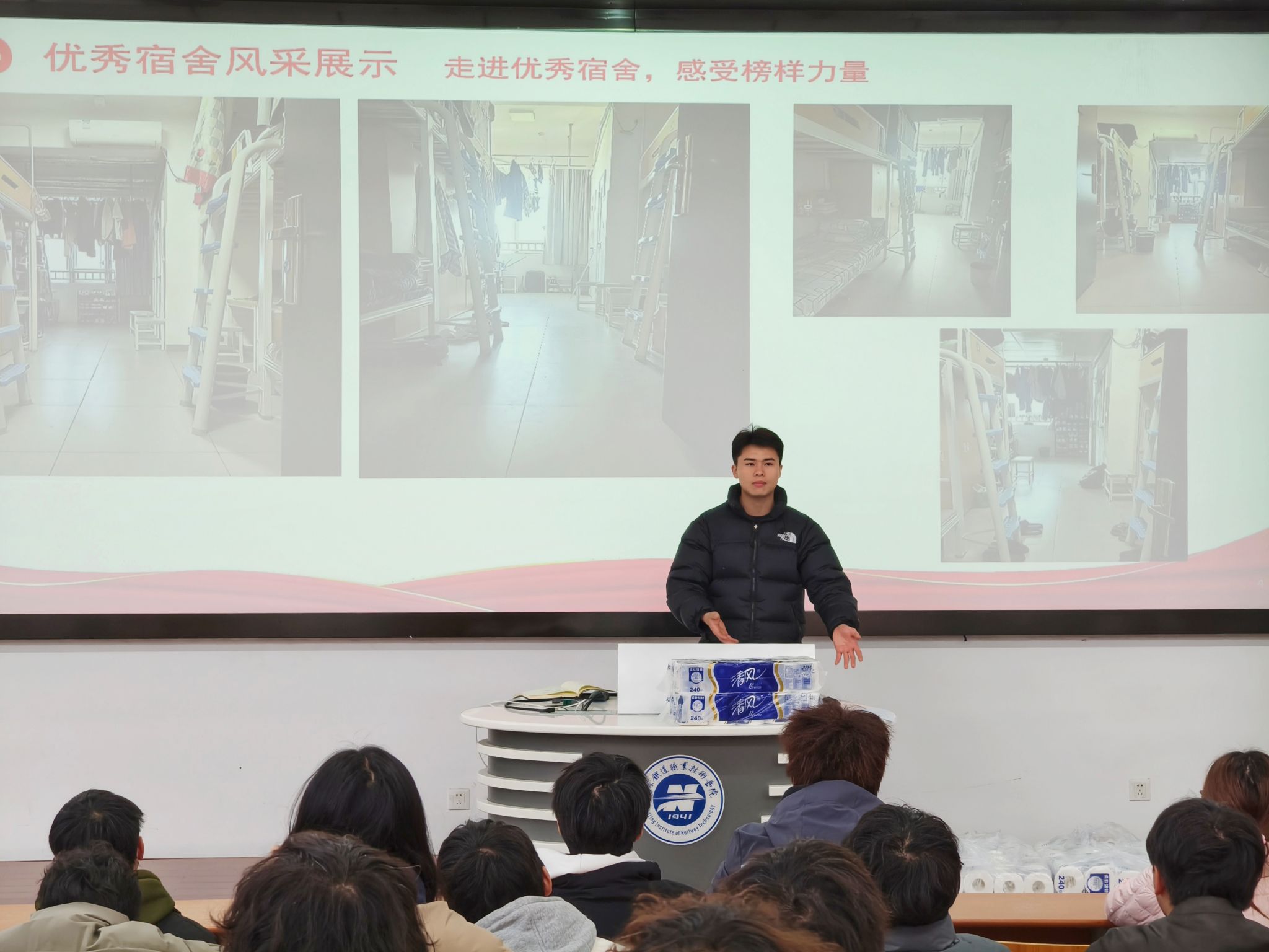 大会伊始,纪有旺对2025年下半年“三和谐”宿舍建设工作进行了全面回顾,表扬了当前宿舍建设取得的成效,并客观指出了当前建设中存在的不足;同时从“筑牢安全防线、美化卫生环境、浓厚学习氛围、营造和谐关系”四个维度阐述了“三和谐”宿舍建设的内核。朱俊岩在发言中强调,学生宿舍不仅是学子日常起居的生活空间,更是涵养品德、交流思想、促进成长的重要育人场域,他号召全院学子以奋发有为的姿态,携手将宿舍打造成崇德励志的“思政园地”与人人眷恋的“温馨之家”。