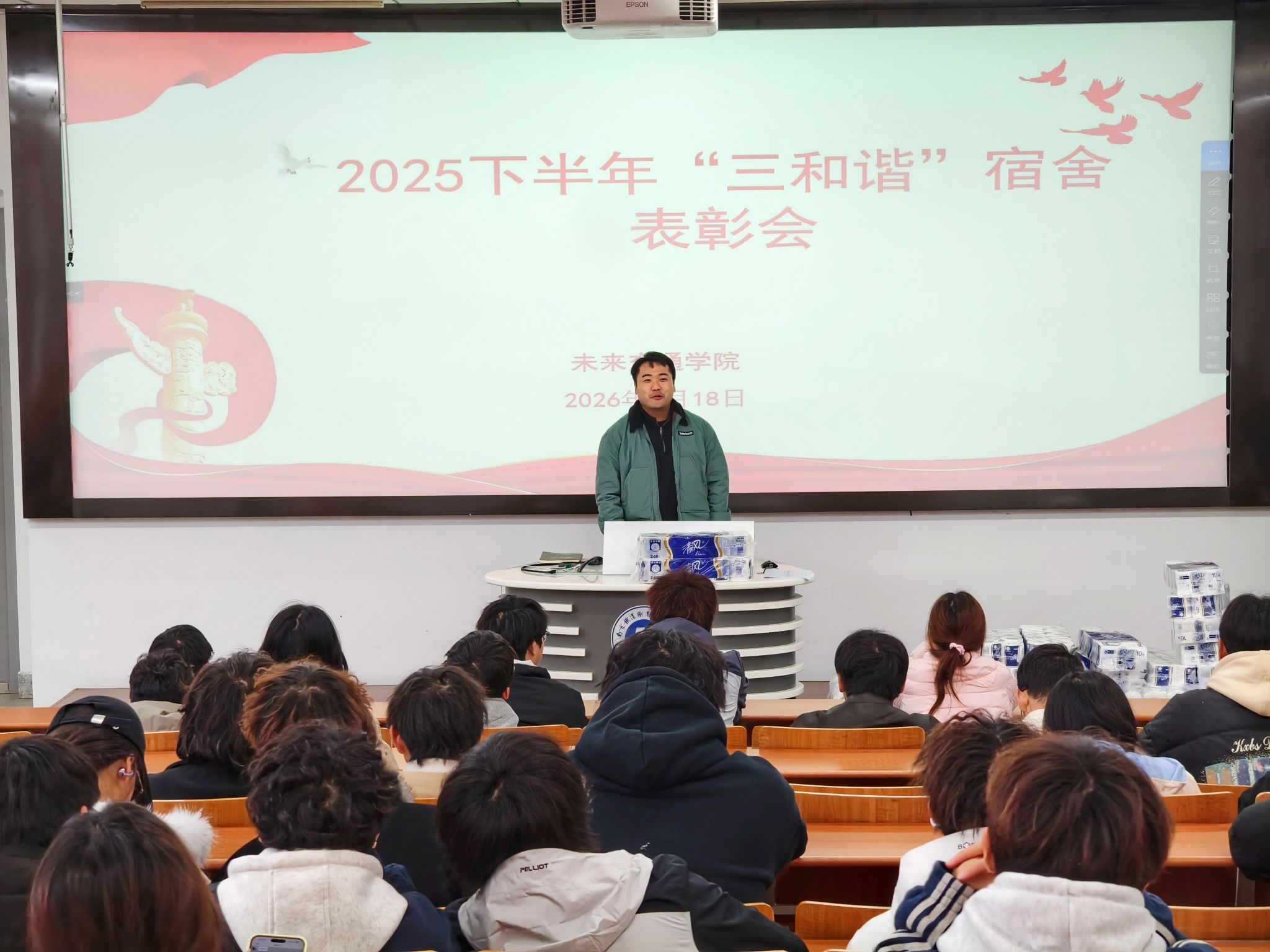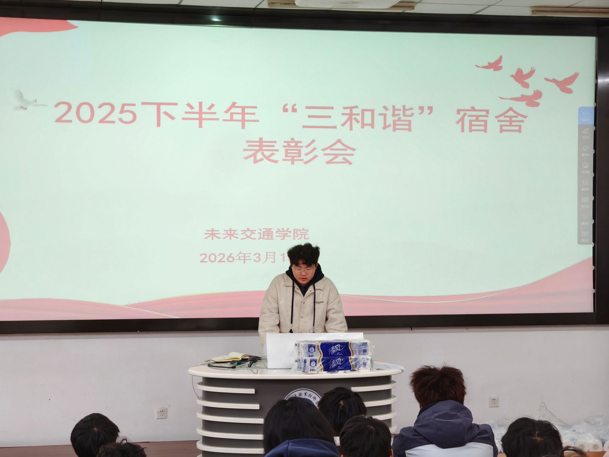 为深化校园精神文明建设,充分发挥“一站式”社区文化育人功能,树立宿舍文明建设的先进标杆,展示学子昂扬向上的精神面貌。3月18日,未来交通学院举办2025学年“三和谐”宿舍表彰大会,辅导员朱俊岩、纪有旺及各获奖宿舍学生代表参加表彰活动。