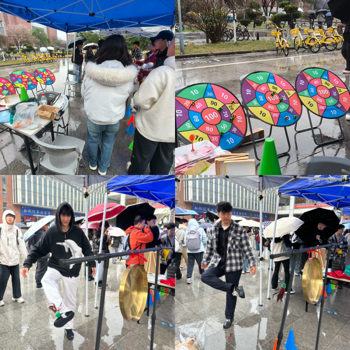 “掷镖寻靶,黏定欢乐”板块吸引了众多同学组队参与。2至3人一组的队伍通过投掷黏黏球进行趣味计分游戏,在轻松互动中释放压力、增进友谊,体现了体育活动的解压效果与德育过程中的团队协作精神。“心随毽动,锣响解压”环节则融合了情绪表达与运动释放。参与同学首先在心中默念或轻声说出自己的压力与烦恼,随后在指定区域踢毽子,努力敲响象征释放的铜锣。当锣声响起,寓意负面情绪一扫而空,在运动中感受情绪的流动与释放,践行“以体强心”的工作理念。