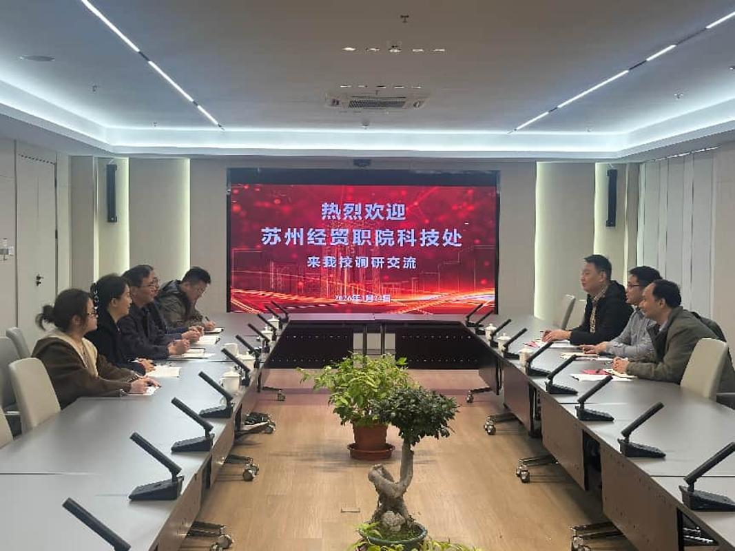3月24日上午,苏州经贸职业技术学院科技处处长许应楠一行来我校调研交流。我校科研处处长金旭东及相关科室负责人热情接待并举行座谈。